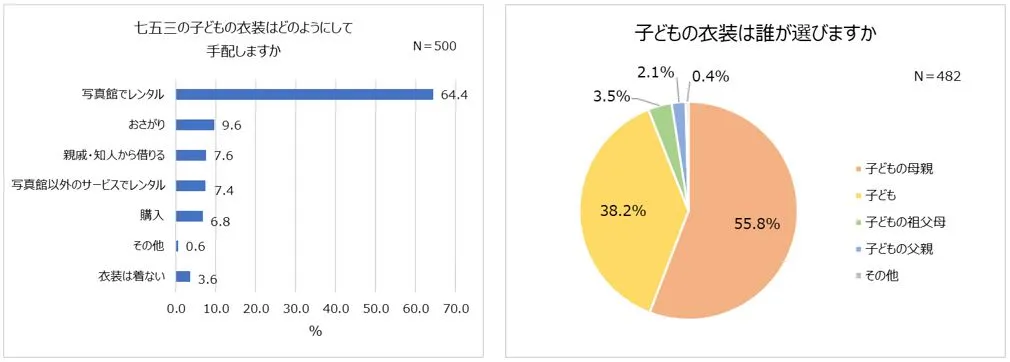 七五三といえば、子どものかわいらしい衣装姿。続いては子どもの衣装事情について調査しました。衣装をどのようにして手配するかについては、6割以上が「写真館でレンタル(64.4%)」と回答。撮影とセットで衣装を借りる人が多いようです。衣装を手配する人を対象に、誰が選ぶのかを聞くと、「子どもの母親(55.8%)」が過半数を占める結果に。「子ども(38.2%)」に選ばせている親も約4割いることも分かりました。