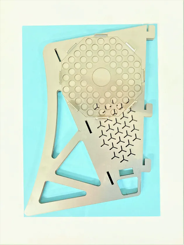 (1) 美しくエレガントな聖火台をイメージし、板金加工で陥りやすい直線的なデザインでは無く、八枚羽組立の多脚構造を取り入れ、剛性を高め流線形の曲線を生かしました。