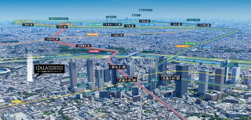 人気の東急東横線をはじめ、JR横須賀線・湘南新宿ラインなど、都心へ直結する各主要路線を自由自在に使いこなすターミナル駅「武蔵小杉」。「渋谷」「品川」「東京」「横浜」駅などの名だたる主要拠点へのダイレクトアクセスを可能にする機動力が、高感度なライフスタイルを実現します。