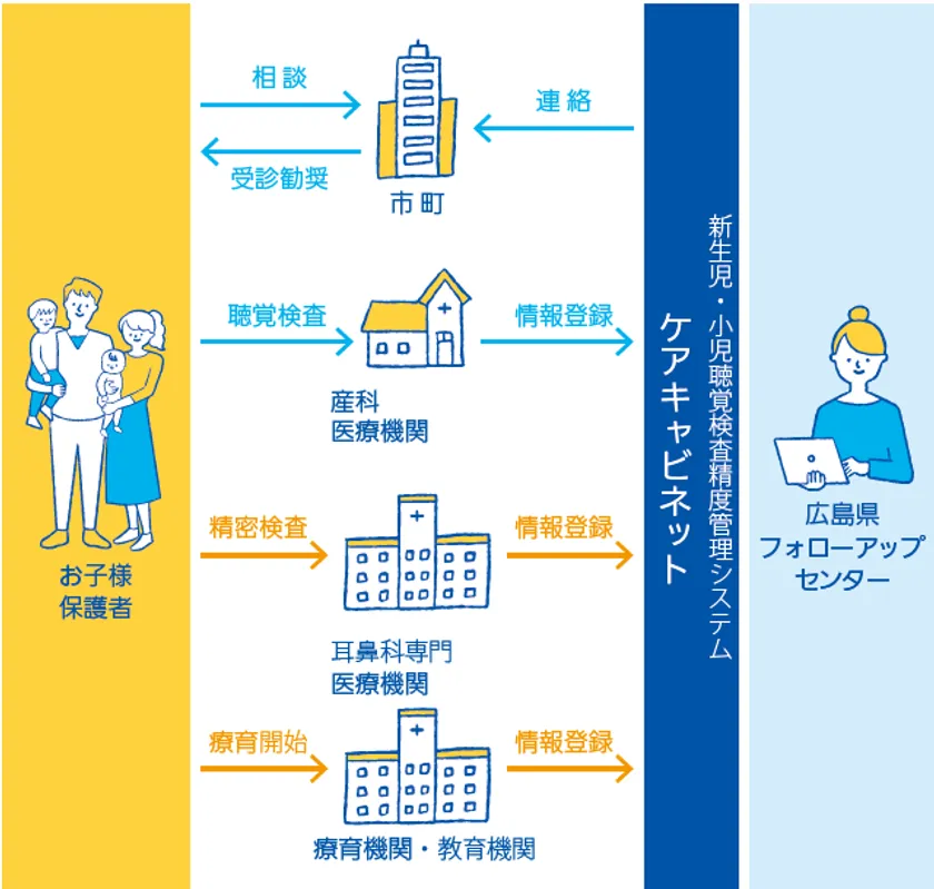 聴覚障害は、早期把握と適切な早期支援が行われることにより、聴覚障害による音声言語発達等への影響が最小限に抑えられることから、厚生労働省は2021年度、全ての新生児で聴覚検査を実施するとの目標を盛り込んだ基本方針をまとめました。各都道府県においては、検査の実施体制及び精度管理体制、早期療育支援体制を整備する必要があります。広島県では県内市町と連携し、生まれて間もない新生児の「耳のきこえ」を検査する「新生児聴覚スクリーニング検査」の普及に継続的に取り組んできました。しかし、各関係機関の連携体制が整備されておらず、要精密検査となった新生児の受診状況や、難聴と診断された新生児や小児が療育・教育機関につながったか等、把握しきれていないことが課題となっていました。そこで広島県は、当社が提供する多職種情報共有システム「ケアキャビネット」を導入し、市町、産科医療機関、耳鼻科医療機関、療育・教育機関とで検査結果の情報を共有しながら迅速に状況を把握し、その後のフォローアップにつなげるための体制を強化しました。
