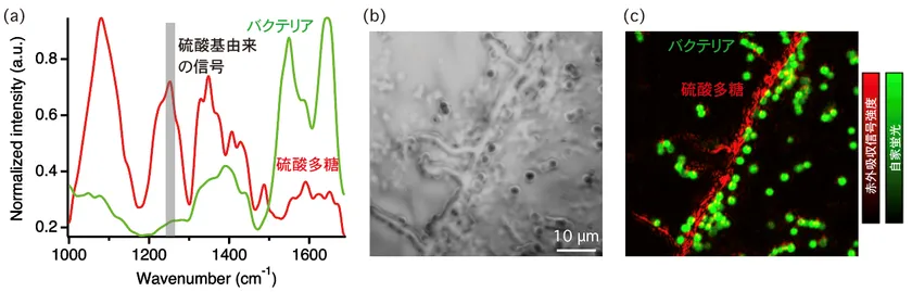 藍藻バイオフィルムの主要構成要素はEPSであり、藍藻は非常に多様なEPSを作ることが知られています。その中でも硫酸基で修飾された多糖類である硫酸多糖※2はバクテリアの中ではほぼ藍藻においてのみ存在が知られています。そのため、研究グループは藍藻硫酸多糖に特異的な役割があると考えており、その研究の一環として、藍藻バイオフィルム中における硫酸多糖やその他の分子の空間分布の可視化を試みました。従来の光学イメージング技術では、硫酸多糖を標識※3して観察する手法が一般的でした。しかしながら、標識により多糖の自己凝集が生じるため、バイオフィルム内の構成分子のありのままの状態を観察することは、これまで困難でした。試料を標識せずにその分子組成を可視化する手法としては、分子の赤外吸収※4を計測する赤外分光法があります。しかし、中赤外光の回折限界※5により一般的な赤外分光法の空間分解能は10 マイクロメートル程度に制限されるため、それよりもサイズの小さなバクテリアやバイオフィルム内の分子構造の空間分布を正確に可視化することは困難でした。