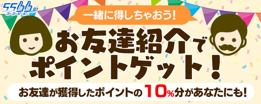 あなたがお友達に55bb.jpを紹介して、お友達がゲームをプレイしてポイントをゲットすると、あなたもポイントがもらえます。紹介すればするほど、もらえるポイントが増えます。