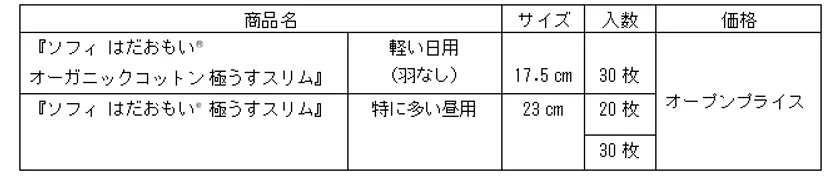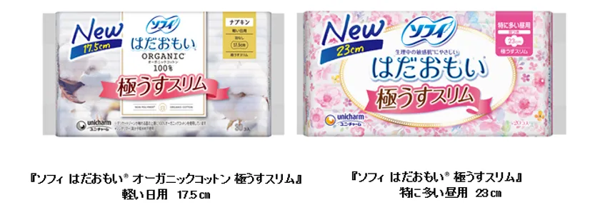 そこでこのたび、『ソフィ はだおもい(R)』から、短めサイズで体にフィットしやすい『ソフィ はだおもい(R)オーガニックコットン※1極うすスリム 軽い日用17.5cm』と、極うすタイプなのに経血の多い昼間も安心な『ソフィ はだおもい(R) 極うすスリム 特に多い昼用23cm』を全国で発売します。