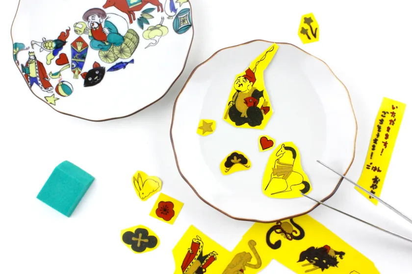 好きな位置に好きなシールを貼って楽しむ九谷焼シール体験
