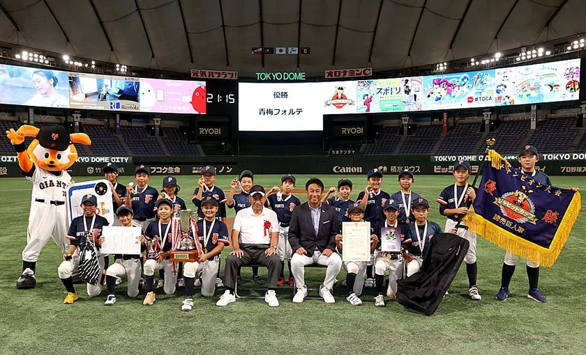 優勝した青梅フォルテの皆さん ジャイアンツアカデミー校長 宮本 和知 氏らと記念撮影