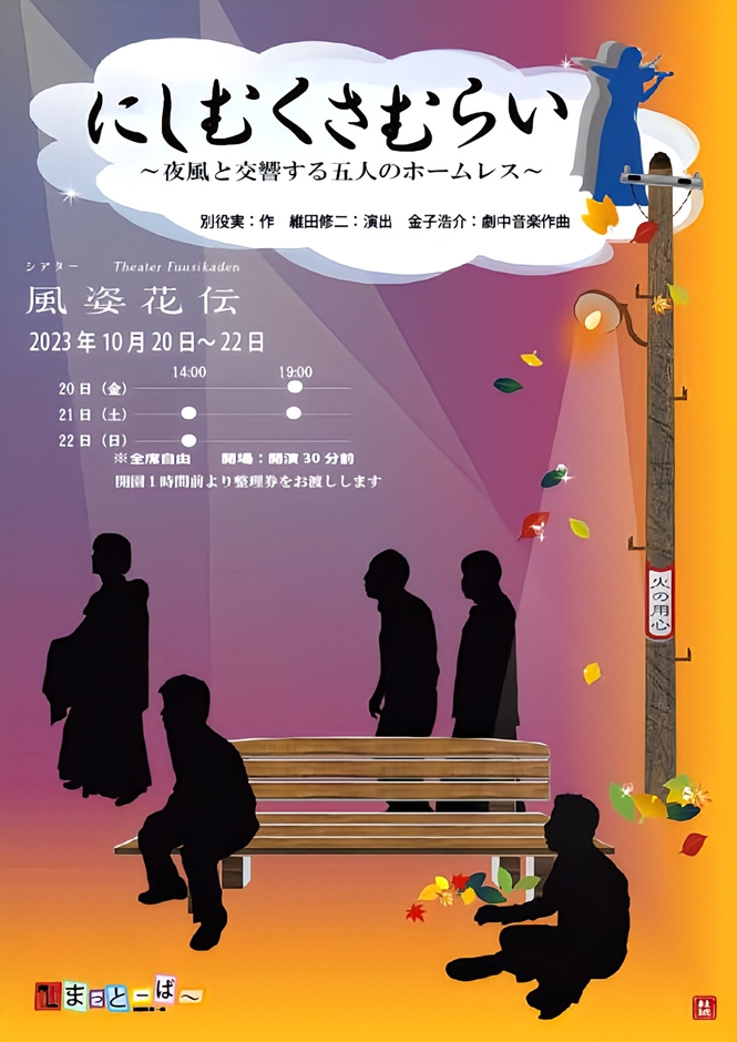 劇団まっとーば~主催、『にしむくさむらい ~夜風と交響する五人のホームレス~』が2023年10月20日 (金) ~2023年10月22日 (日)にシアター風姿花伝(東京都新宿区中落合2-1-10)にて上演されます。