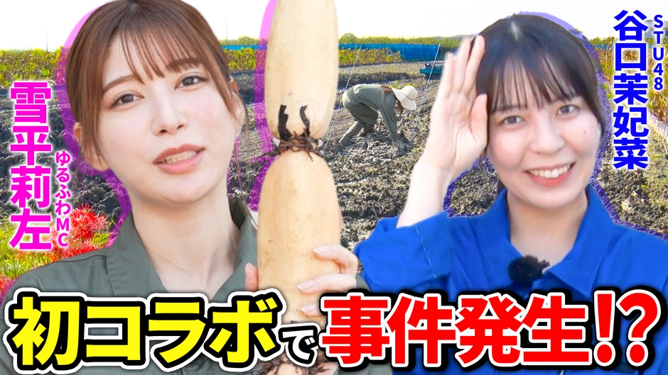 今回は「初コラボのりーちゃんこと雪平莉左とまひちゃんこと谷口茉妃菜の事件連発レンコン掘りが最高に楽しい産地ロケ動画です」と題し、ゲストにSTU48の谷口茉妃菜さんを迎えて、「レンコン掘り」と直売所での「お買い物企画」をお届けします。