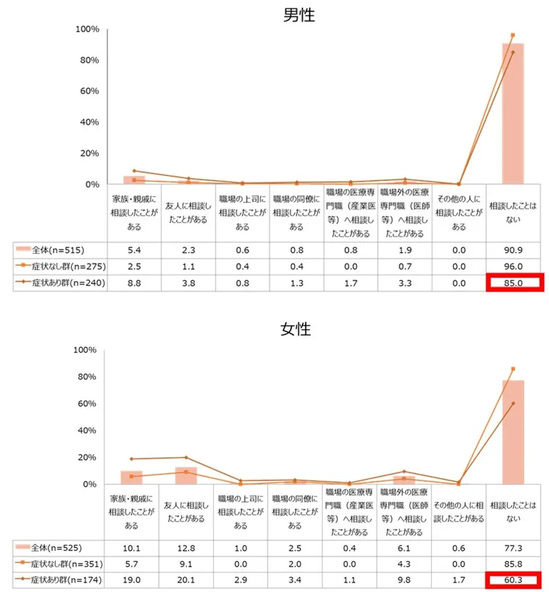 ・更年期症状・障害がある人の中で、男性の85.0%、女性の60.3%が、更年期症状・障害に関して誰にも相談していないことが明らかになった。