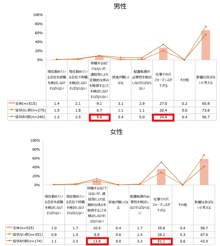 症状あり群の中で「仕事でのパフォーマンスが下がる」と回答したのは、男性34.6%、女性51.1%であった。症状あり群の男性の9.6%、女性の13.8%が「休職するほどではないが、通院等により定期的な休みを取得することを検討しなければならない」と回答するなど、更年期症状・障害に伴う仕事への影響が一定程度あることが明らかとなった。今後は仕事のパフォーマンスに影響をもたらす更年期症状・障害とうまく付き合いながら働き続けるための環境整備や周囲の理解が必要と考えられる。