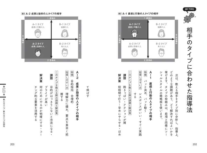 加えて、本書では、「型(セオリー)」を学んだのち、「教えるタイプ」と「教わるタイプ」の相性や、タイプ別の指導法なども紹介。指導方法に迷った際も、振り返ることができる仕様となっています。