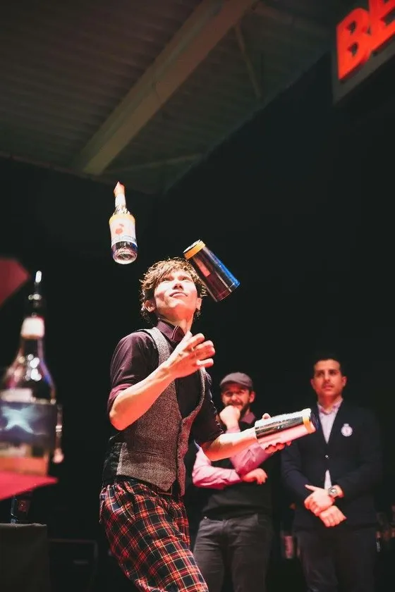 ボトルやシェイカーを投げながらいつの間にかカクテルを作るダイナミックなパフォーマンスショー「フレアバーテンダーMITSU氏」による圧巻のパフォーマンス