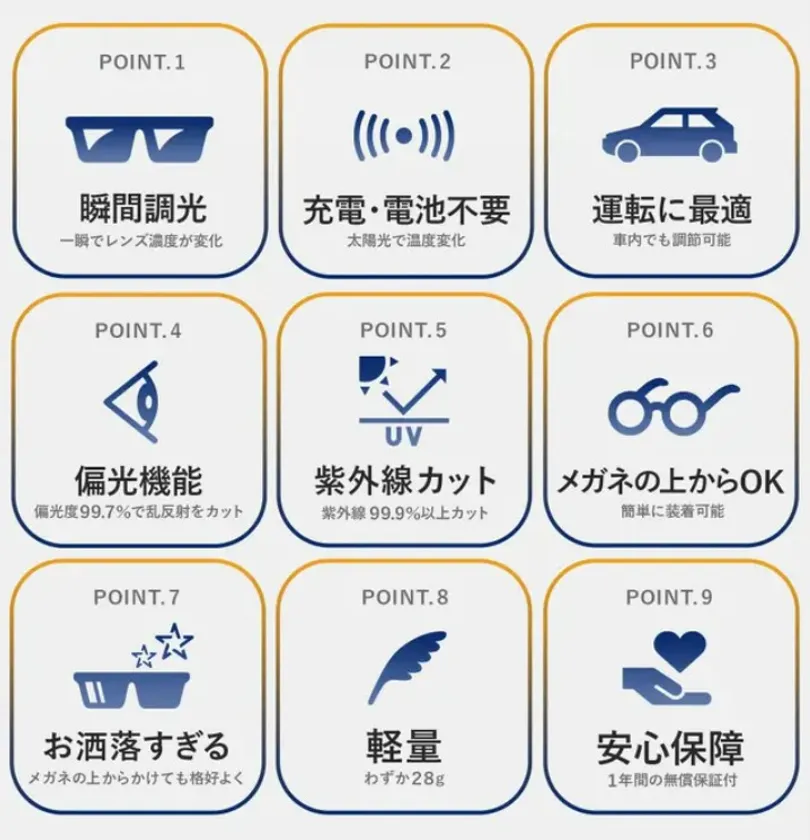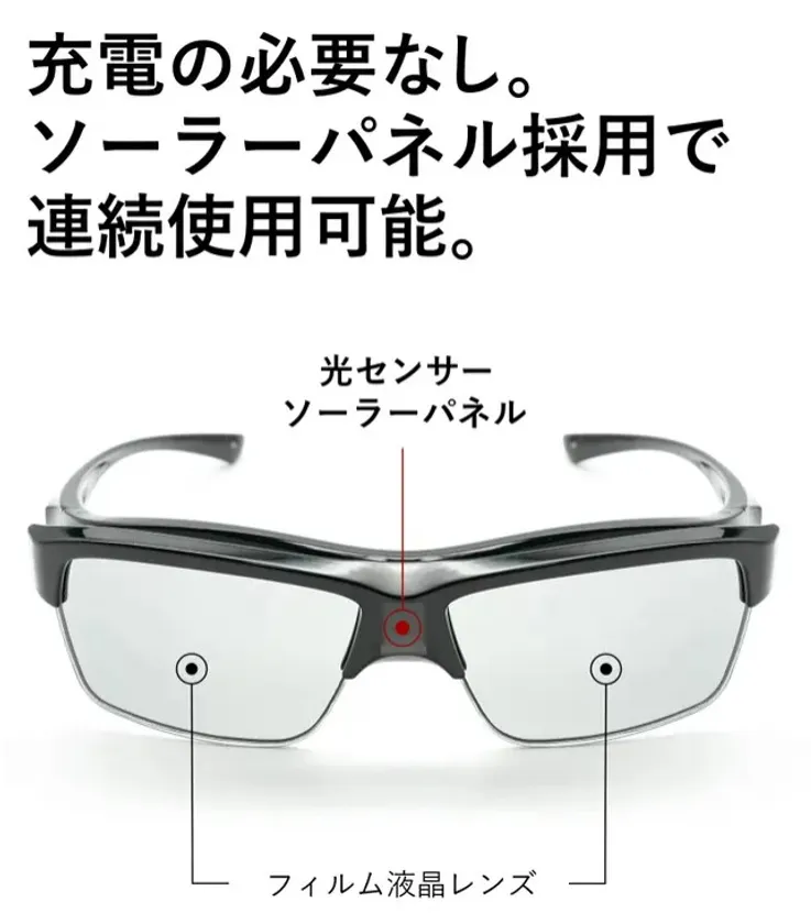 偏光度99%以上で乱反射をほぼカットして見やすく、紫外線は99.9%以上カットして目に優しいレンズです。光の度合いによってレンズ濃度が変化するため、充電等一切必要ありません。