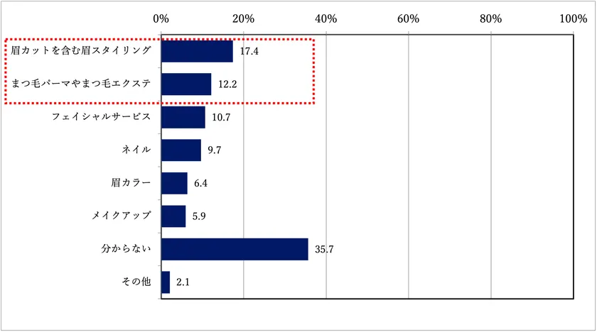 「眉カットを含む眉スタイリング」との回答が第1位で17.4%(126名)、「まつ毛パーマやまつ毛エクステ」が第2位で12.2%(88名)でした。