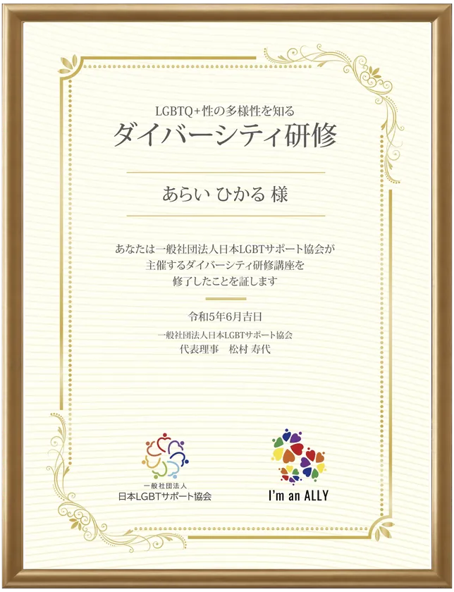 本研修を受講後、ご希望の方は「オリジナルアライマーク入りの名入りオリジナル研修修了証書」のご購入が可能です。