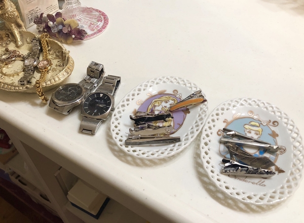 ついごちゃっと置いてしまうタイピンをプリンセスの小物入れに収納。