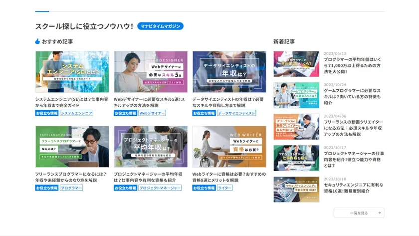 IT人材になりたい人が知りたい情報を学べる「マナビタイムマガジン」も運営。利用ユーザーの観点を大切にマナビタイム編集部が独自調査を行い、就職/転職、収入、仕事内容、業界動向など、IT人材にとって必要でリアルなお役立ち情報を過不足なく情報提供しています。また「特集記事」では、トレンドや注目を集めるテーマを切り口に、独自の視点で発信。今後もさまざまな角度から、わかりやすいをモットーに特集記事を更新していきます。