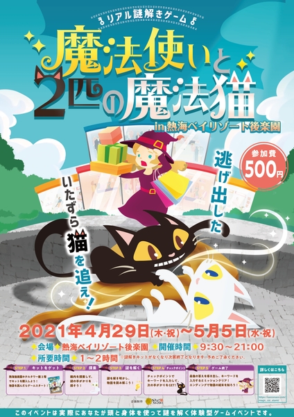 リアル謎解きゲームを使ったプロモーションを提案する株式会社ハレガケ(本社:東京都豊島区、代表:黒田洋介)は、熱海ベイリゾート後楽園 (所在地:静岡県熱海市)と共に2021年4月29日(木・祝)から5月5日(水・祝)にかけてリアル謎解きゲーム「魔法使いと2匹の魔法猫」を開催します。