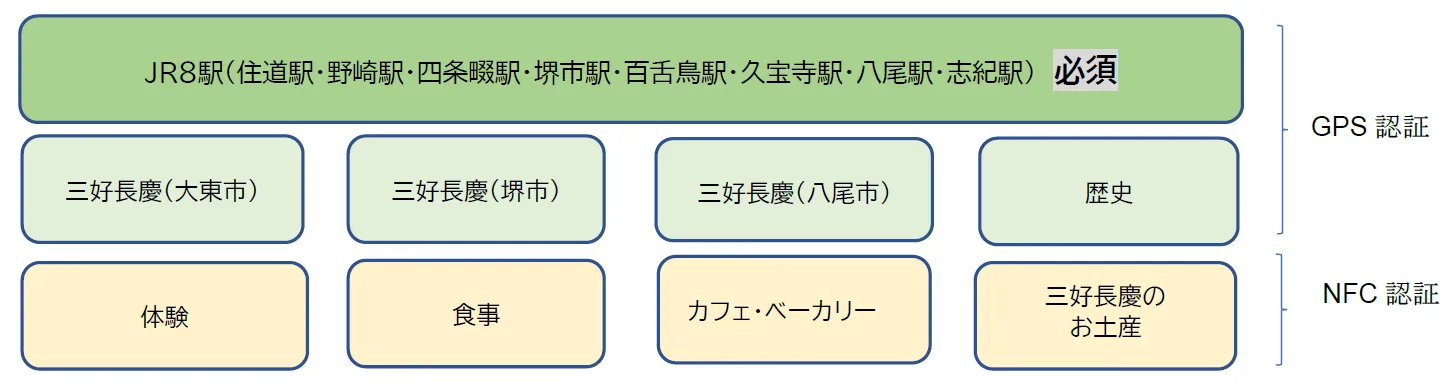 NFC認証:スポットに設置されたNFCタグにスマホをかざすことによりスタンプを獲得