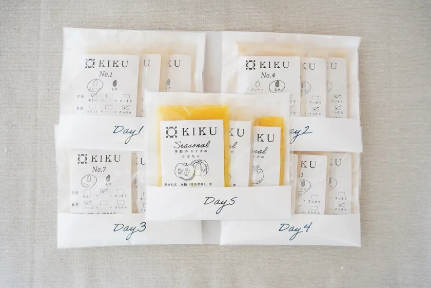 本ブランドのメインサービスとなる甘酒サブスクリプションサービス「KIKUドリンク」は、原材料であるプレーン(白米)と玄米、甘さや食感など異なる21種類からお客様の「今」の好みに合わせて3種類の甘酒を選ぶことができる、税込・送料込で月間2,980円と業界最安値の甘酒サブスクサービスとなります。サブスク契約をされたお客様が選択した3種の甘酒(1袋500ml入り×3種、同じ種類も選択可能)を、毎月1日・15日の2回、合計6種類(500ml×6種)お届けいたします。また、初回注文時には甘酒の保管に使える「専用ボトル」が付属し、ボトルに記載された計量線をもとに毎日100mlの甘酒をお召し上がりいただけます。