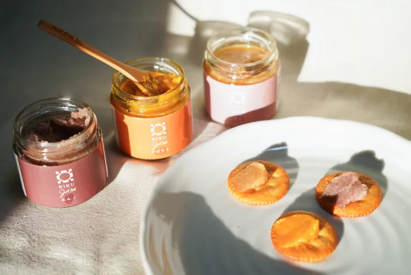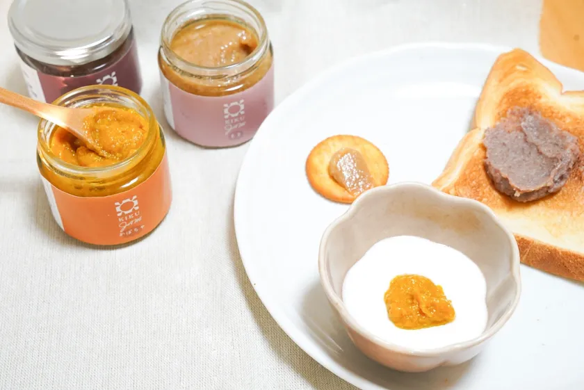 材料として使うのは、季節の果物や野菜と麹のみ。甘味料や食品添加物、着色料は一切使用せず、60度近い糖度に調整した、砂糖不使用の子供も安心して食べられるジャムです。旬のイチゴやカボチャなどをそのまま発酵させてつくる「KIKUジャム」は、砂糖を入れて作ったジャムのような甘さと素材そのものの美味しさを引き出した商品となっております。ビタミンB群などの栄養素や食物繊維も豊富なため腸内環境を整えることもできるのも嬉しいポイントです。乳製品との相性が良いのでバタートーストに塗って、また、ヨーグルトに入れてお楽しみください。