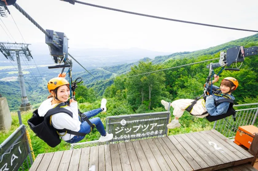 ロッテアライリゾートのジップツアーは全長1,501m、標高950mのスタート地点から一気に下り降ります。その高低差はなんと240m。