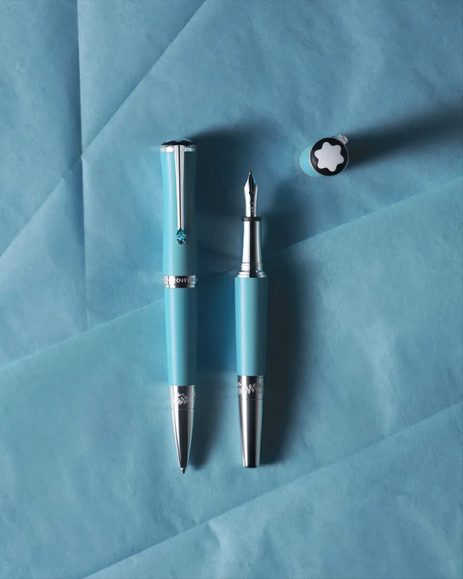 マリア・カラスは、従来のソプラノ歌手の定義を超える3オクターブ近い声域を持つと同時に、息をのむような美貌で人々を魅了する術も心得ている女性でした。モンブラン ミューズ マリア・カラス スペシャルエディションのキャップと胴軸のターコイズのプレシャスレジンは、彼女が好んだ色のひとつで、筆記具全体のフォルムは、スレンダーでエレガントなシルエットのマリア・カラスの優雅な美しさを表現しています。