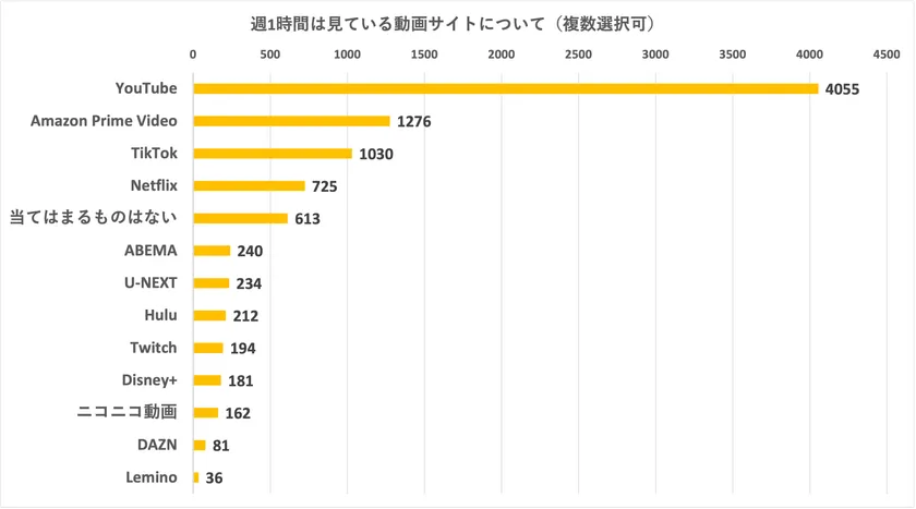 週1時間以上の利用者数が圧倒的に多かったのはYouTubeとなりました。YouTubeはYouTuberたちがさまざまなコンテンツをアップロードしていて、無料で見れる動画が非常に豊富であるのが他の動画サイトにはない強みだと考えられます。さらには、YouTube Liveでライブ配信を観れたり、映画の購入視聴など動画に関するサービスは一通り揃っているため、この結果に繋がったのではないでしょうか。