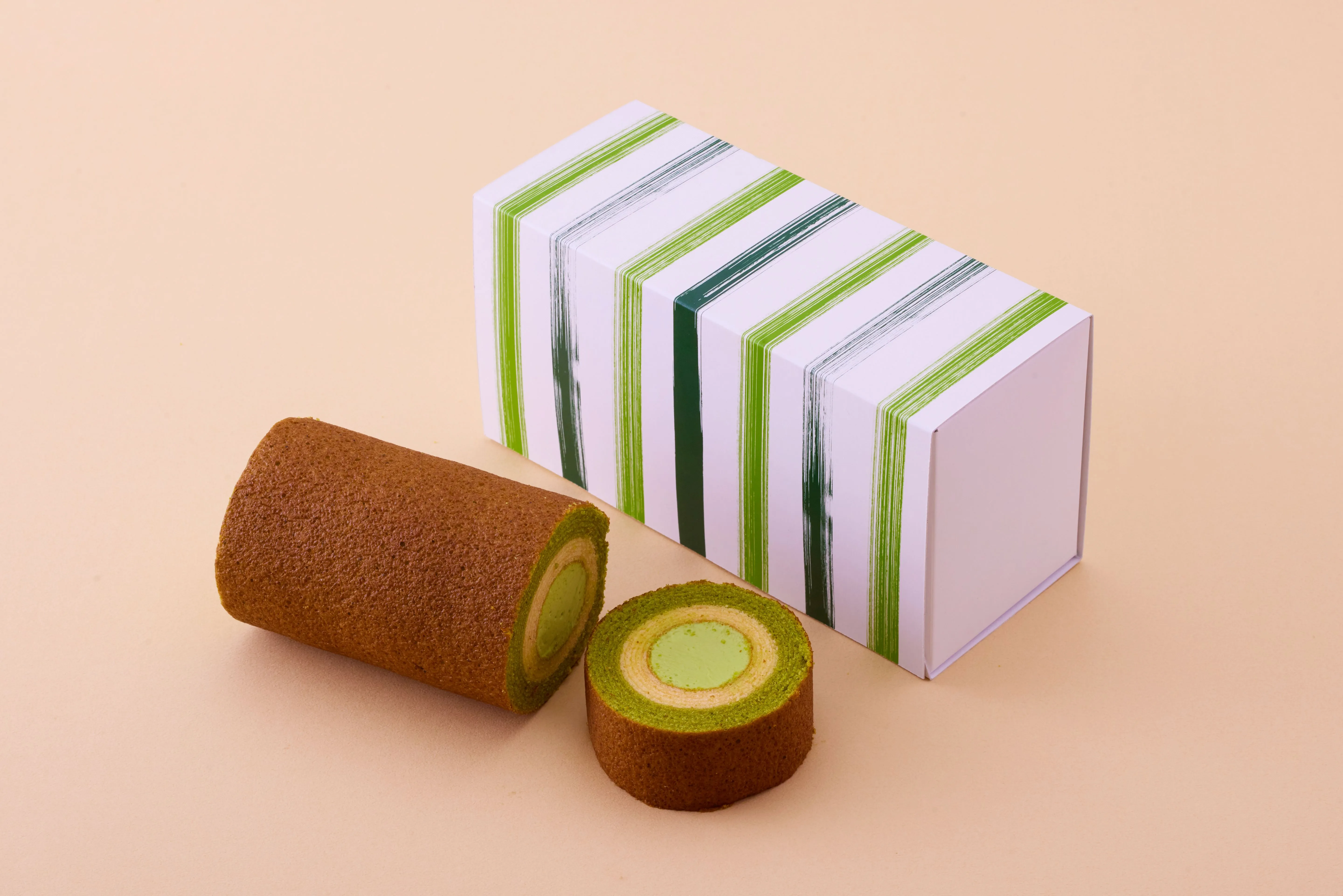「京ばあむ」と同じ京都産宇治抹茶を使用したロールケーキです。抹茶生地と豆乳生地の中に、抹茶のバタークリームを詰めました。京ばあむとは異なる三層を楽しめます。