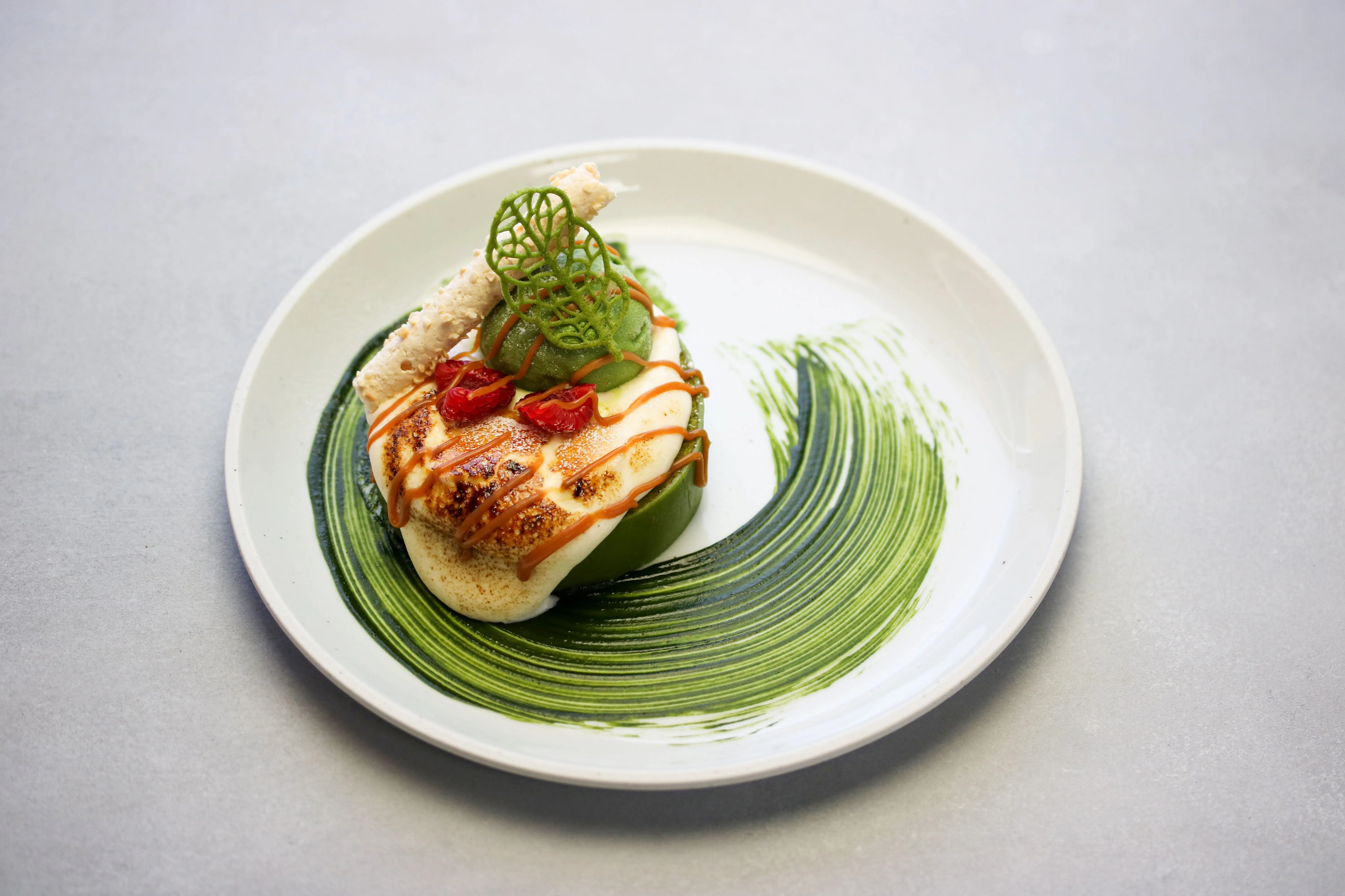 ミニサイズの京ばあむに、抹茶ジェラートやバニラクリームをトッピング。フランボワーズのコンフィチュールがアクセントとなった、見た目も楽しめる一品です。