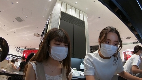 「ダイビングでできたシミ・そばかすを目立たなくしたい」と話すお客さんに、中村さんはカバー力の高いファンデーションを選びました。お客さんはマスク姿で顔全体が見えない上、新型コロナウイルスによる感染の拡大を防止するため、美容部員はお客さんの顔に直接触れることができません。そのため、使用法やメイク法を説明するのも全て口頭で行わなければなりません。そこで中村さんは「眉間から生え際に」などポイントとなる箇所は具体的な名称で、さらに指の動かし方や力加減は「トントントン」「スーッ」「クルクルクル」といった擬音で細かいニュアンスを伝えていきます。