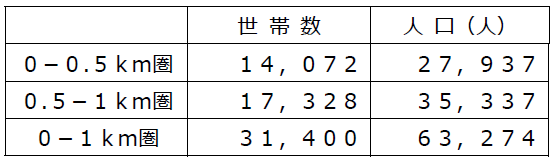 ・店舗から1㎞圏内は単身世帯比率が44.3%、2人世帯比率が26.1%、3人世帯比率は16.4%で、65歳未満の夫婦と3人世帯が東京都の平均より多い地域です。