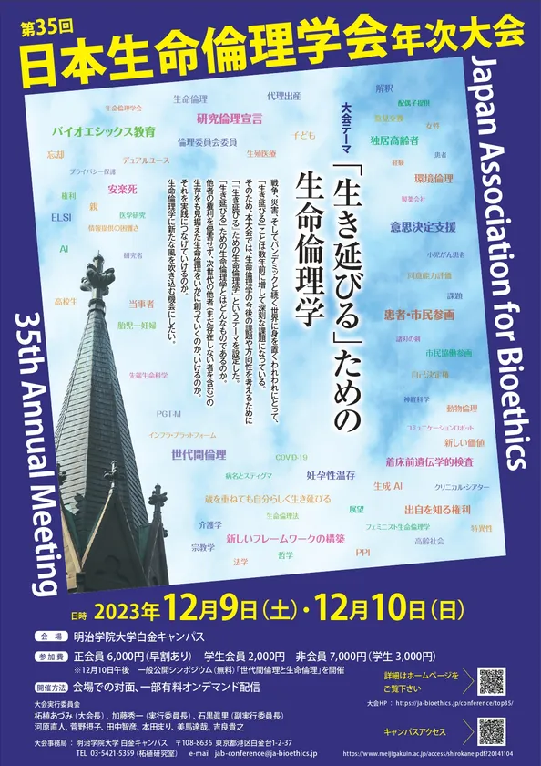 日本生命倫理学会は2023年12月9日(土)・10日(日)に、明治学院大学が後援する『第35回年次大会』(大会長・柘植あづみ 明治学院大学教授、於明治学院大学白金校舎)を開催します。テーマは「『生き延びる』ための生命倫理学」です。戦争、災害、パンデミック、地球の気候変動と続く世界に身を置くわれわれにとって、「生き延びる」ことは数年前に増して深刻な課題になっています。そのため、本大会では、「生き延びる」ための生命倫理学とはどんなものか、他者の権利を侵害せず、次世代の他者(まだ存在しない者を含む)の生存をも見据えた生命倫理学をいかに創っていけるのか。それを実践につなげていけるのか。生命倫理学に新たな風を吹き込む機会にしたいと思います。