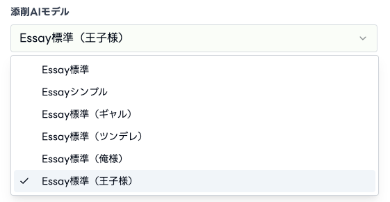 ライティング採点画面の「添削AIモデル」のプルダウンから「王子様」を選択するだけで、どなたでも無料でご利用いただけます。