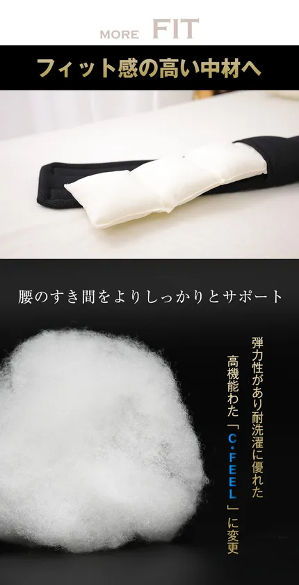 腰のすき間をよりしっかりサポートするために、高さ調節のためのパッドを高さ調節パッド3枚から、「中わたパッド1枚、高さ調節パッド2枚」にリニューアルしました。
