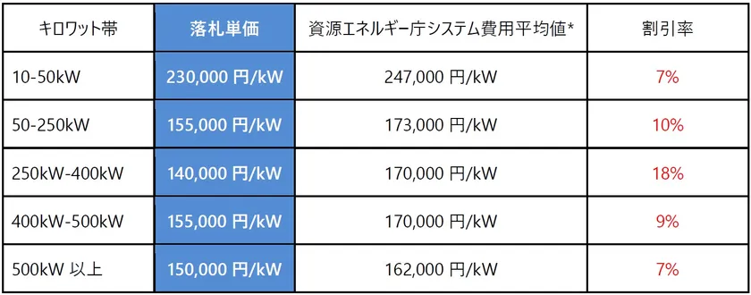 「事業用太陽光発電設備等共同購入支援事業に関する協定」( https://www.pref.shizuoka.jp/sangyoshigoto/kigyoshien/energy/1055276.html )に基づき、事業者用太陽光発電設備の共同購入を静岡県内で実施、令和5年10月10日に複数の販売施工事業者による入札の結果、最も好条件を提案した販売施工事業者に落札が決定しました。入札単価は下記図表参照。