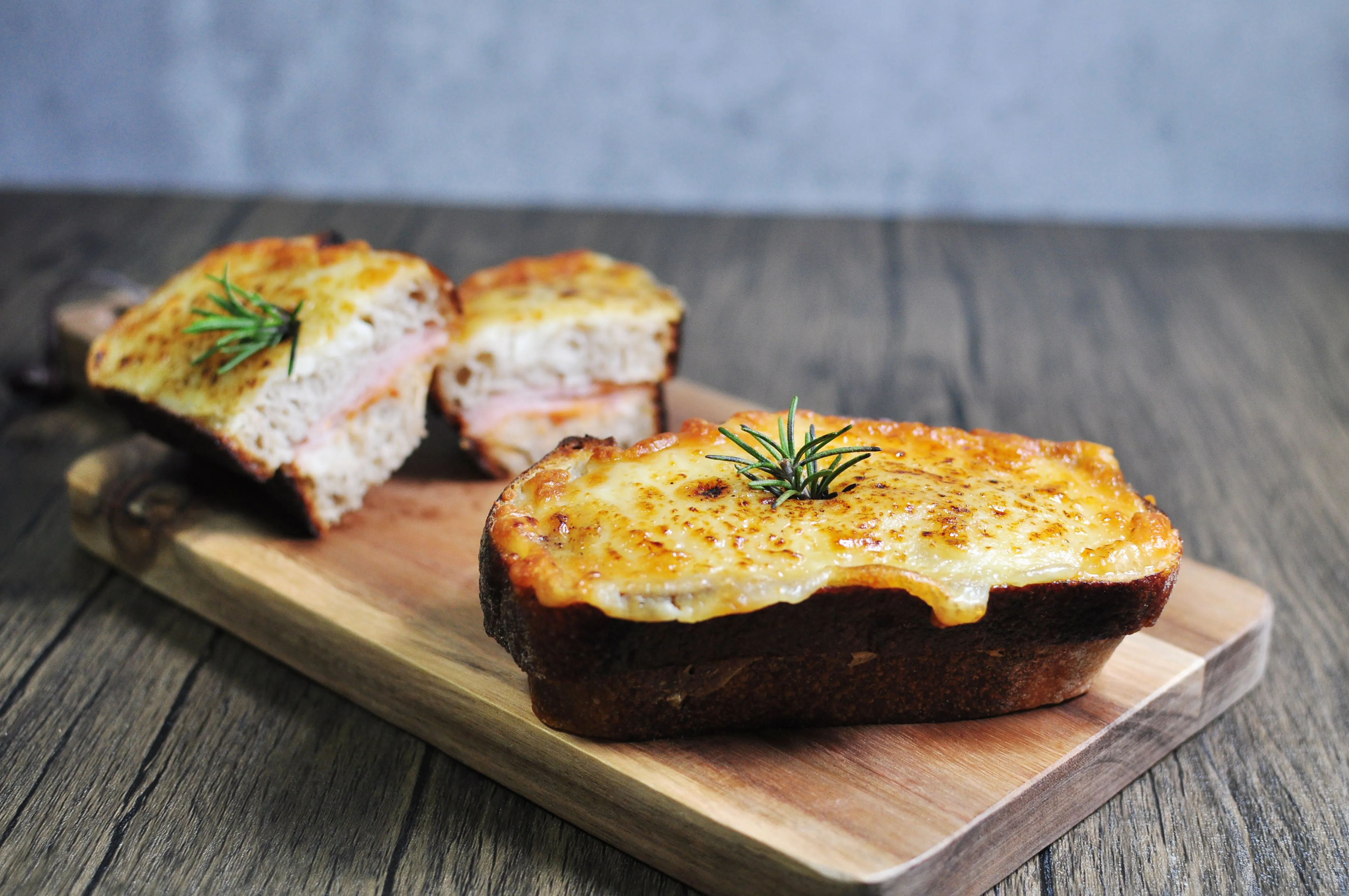 ハムとチーズの塩気とベシャメルソースのコクが口の中いっぱいに広がります。香ばしく焼き上げたカンパーニュを使用しました。
