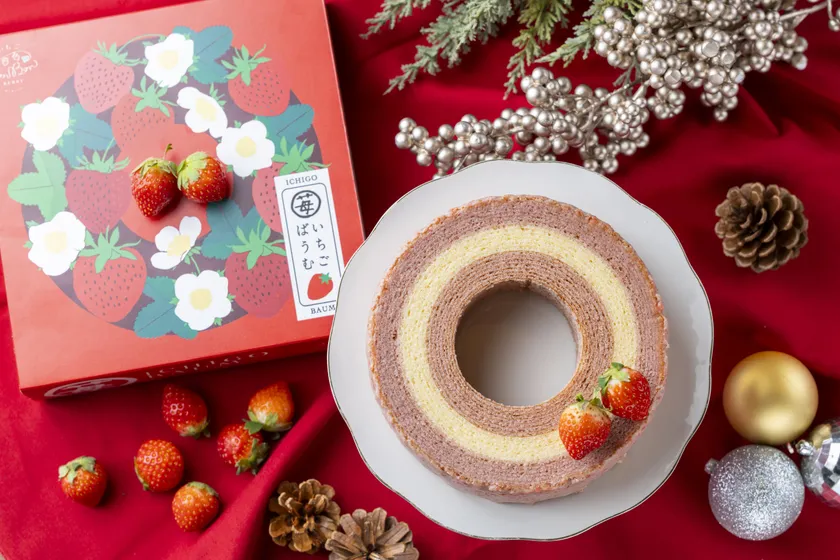 人気商品「いちごのバームクーヘン」もクリスマス期間限定パッケージにて初登場します。店内工房にて丁寧に焼き上げた、紅ほっぺいちごと練乳の三層生地が織りなす自慢の味わいです。