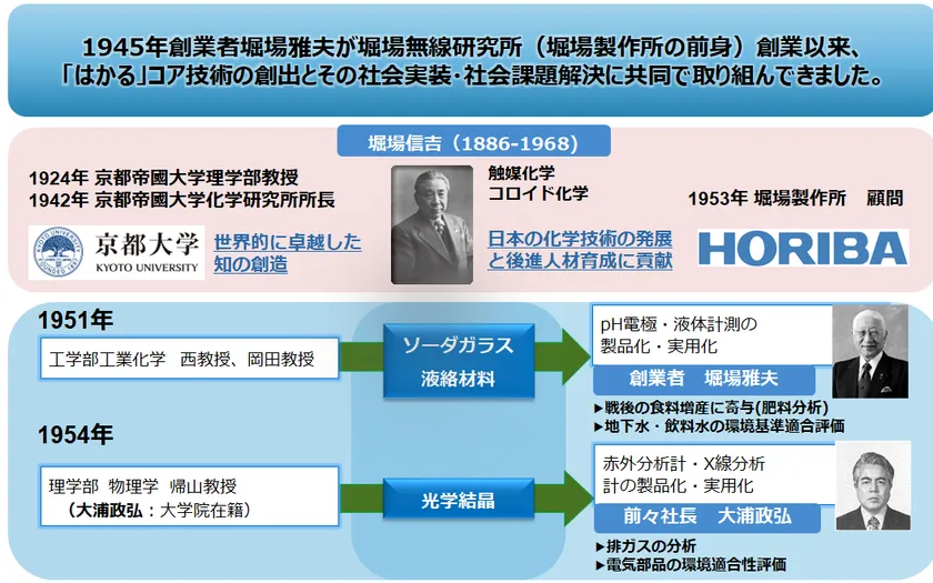 創業者の堀場雅夫は京都大学理学部物理学科で学び、在学中に私設研究所として堀場無線研究所(堀場製作所の前身)を創業しました。堀場雅夫は、京都大学の強みでもあった材料工学・化学工学の研究成果を産学連携として技術導入することでガラス電極を実用化し、1951年に国産初のガラス電極式pHメーターを開発しました。この信頼性の高いpHメーターは、戦後の食料増産(肥料分析)や地下水・飲料水の環境基準適合評価など、当時の社会課題解決に大きく寄与しました。