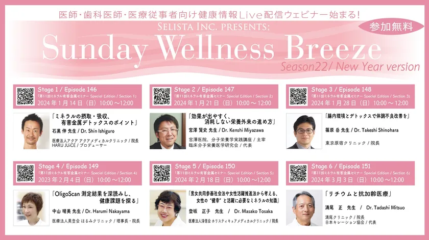 セリスタ株式会社(東京都千代田区 代表取締役 伊藤 承正)は、医師・歯科医師・薬剤師・医療従事者向けに、ほぼ毎週日曜日の朝10時に開催している無料オンラインセミナー「Sunday Wellness Breeze」のSeason 22 Special Editionとして、2024年1月14日(日)から6回にわたり『第11回ミネラル・有害金属セミナー』を開催します。