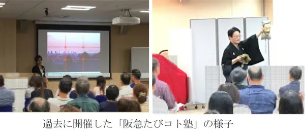 阪急阪神ホールディングスグループの社会貢献活動「阪急阪神 未来のゆめ・まちプロジェクト」の一環として実施している取組です。阪急電鉄・阪神電気鉄道の駅などで、沿線の市民団体やグループ各社などが協働して、お客様参加型のワークショップやセミナーを定期的に実施しています。同プロジェクトに関する情報発信のほか、大人向けに被災地支援につながるセミナーや、こども向けに身近な環境について学ぶイベントなどを実施しており、地域住民の皆様に社会課題を知る機会や学びの場を提供することで、「未来にわたり住みたいまちづくり」への共感や機運を高めることを目指しています。