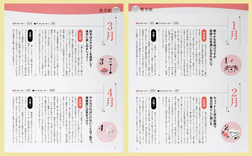 全体運、運気バロメーター、健康運、対人運、金運、仕事運、恋愛・家庭運、旅行運、そして月別の運勢を掲載。