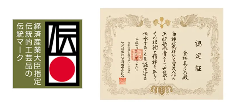 左:経済産業大臣指定 伝統的工芸品のマーク/右:上賀茂神社による木目込み人形 正統伝承者の認定証