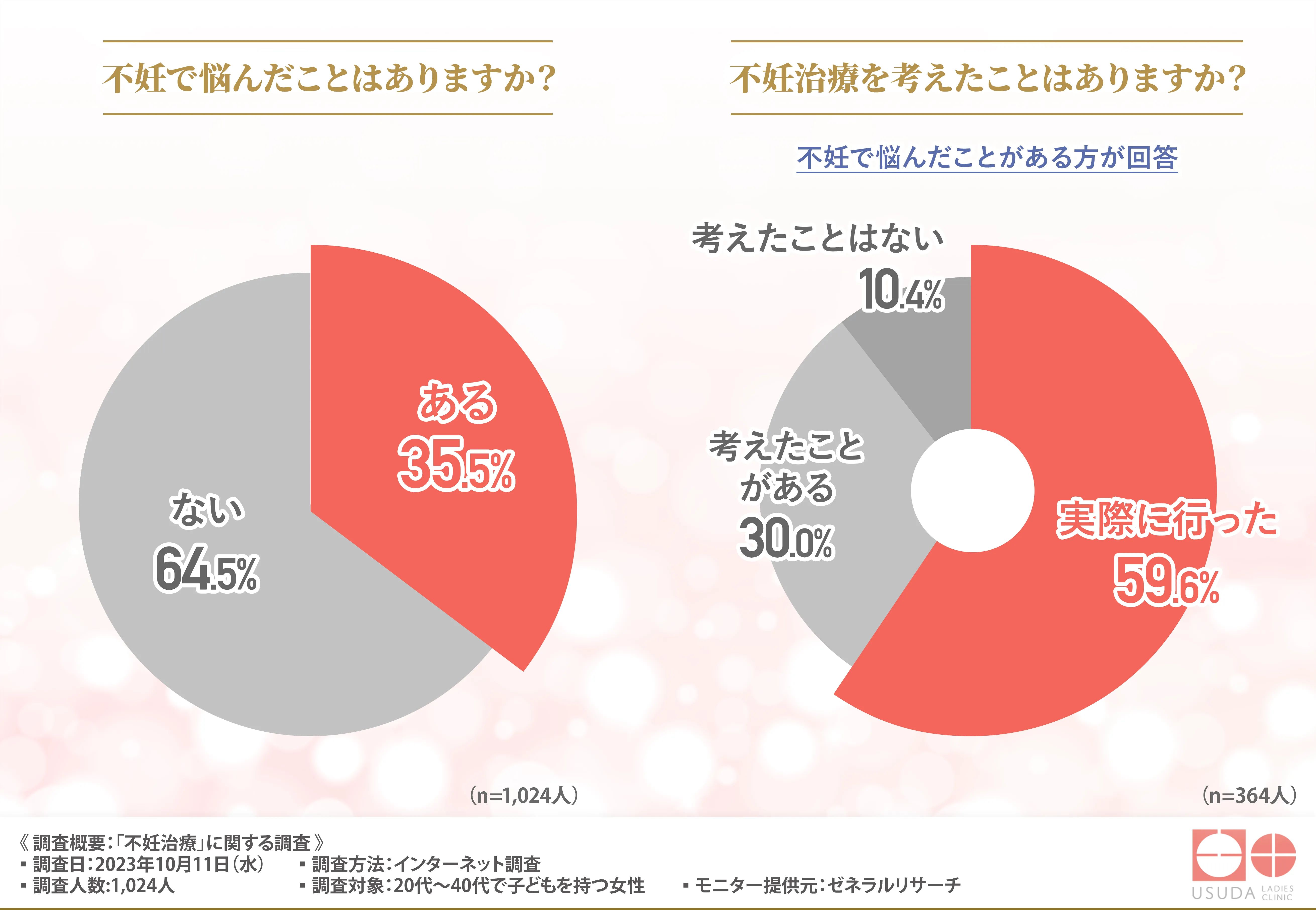今回の調査結果で、子どもを持つ20代~40代女性の3割以上が不妊で悩んだ経験があり、そのうち半数以上の方は、実際に不妊治療を行っていたことが明らかになりました。