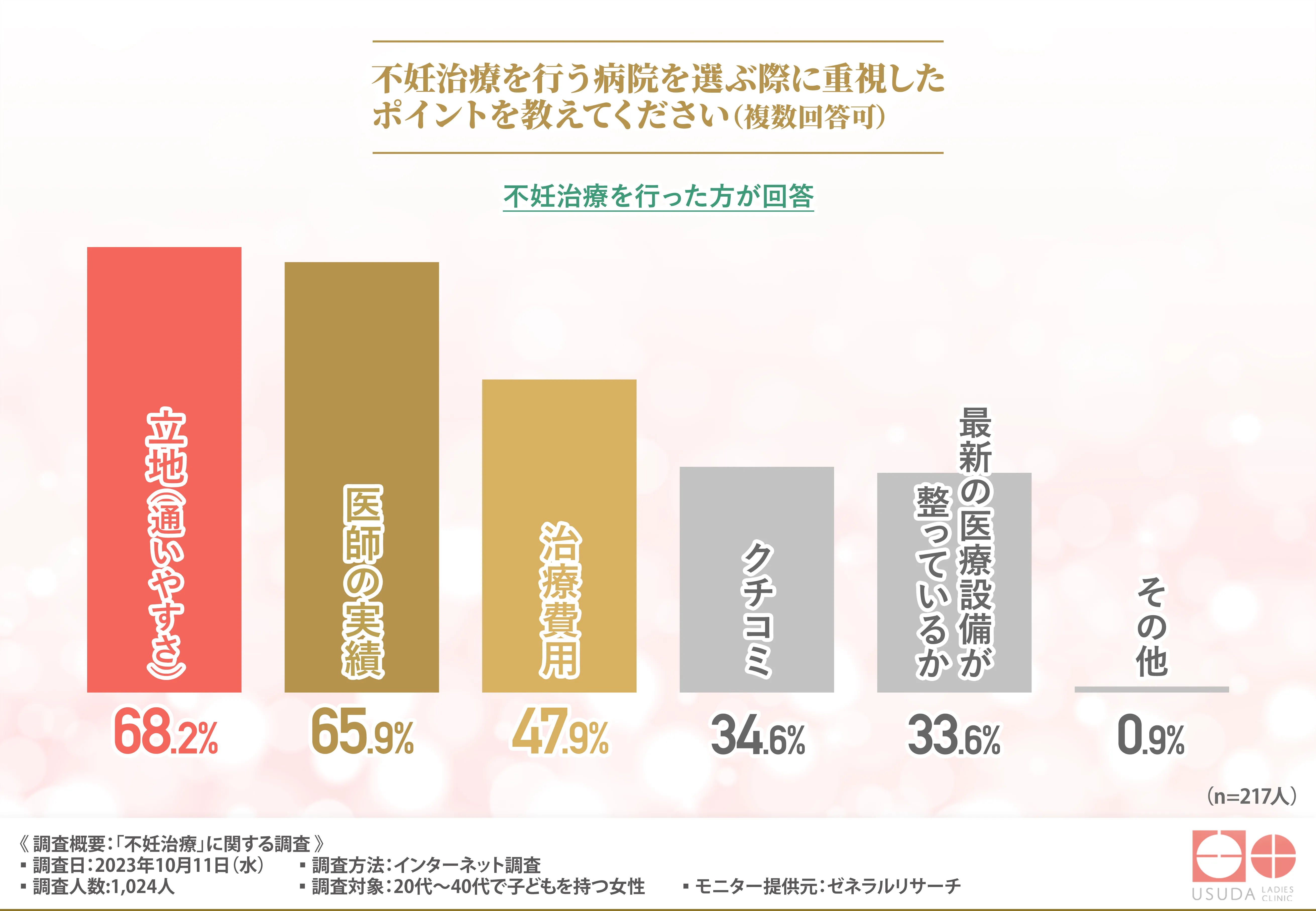 今回、「不妊治療」に関する調査を実施したうすだレディースクリニック(https://usuda-clinic.com/)は、不妊治療機関としての専門性と女性のトータルケアをサポートするホームドクターとしての役割を兼ね備えた施設です。