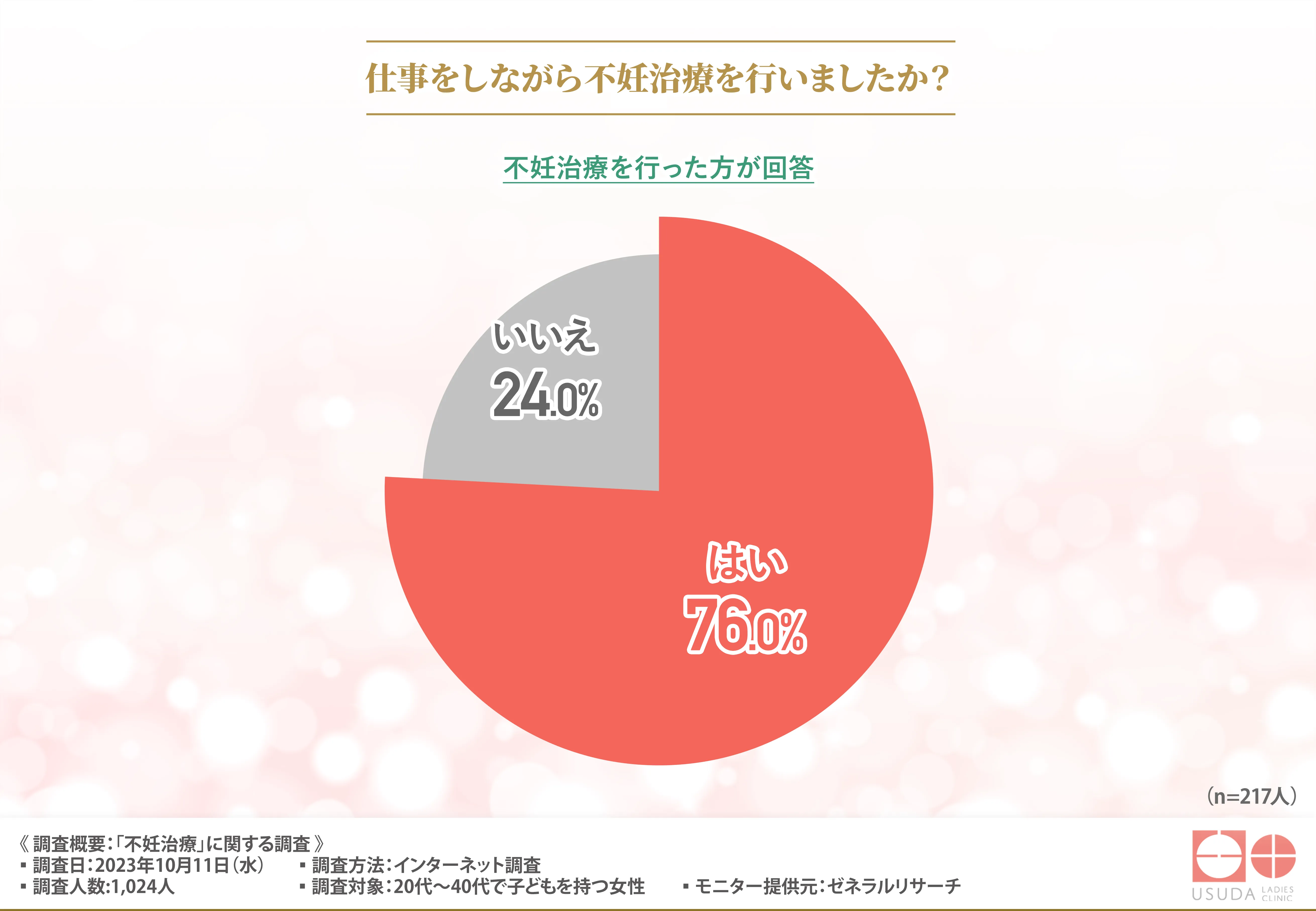 「仕事をしながら不妊治療を行いましたか?」と質問したところ、7割以上の方が『はい(76.0%)』と回答しました。