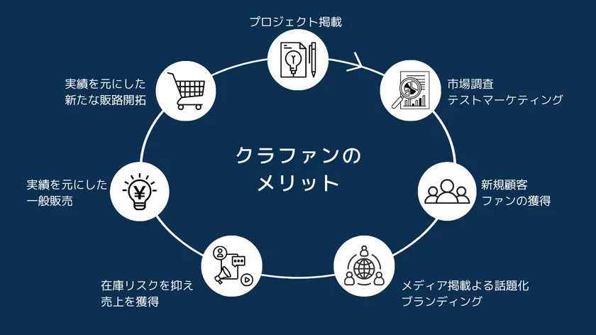 なおCFの特色の一つとして、リアルタイムでの支援額が可視化されています。CFに掲載した商品・サービスは、可視化された支援実績を元に販路拡大をしやすくなります。「1-2ヶ月で●●万円、または◆◆個売れた」という実績を見れば、人気がある商品だということが消費者もバイヤーも一目で分かるためです。