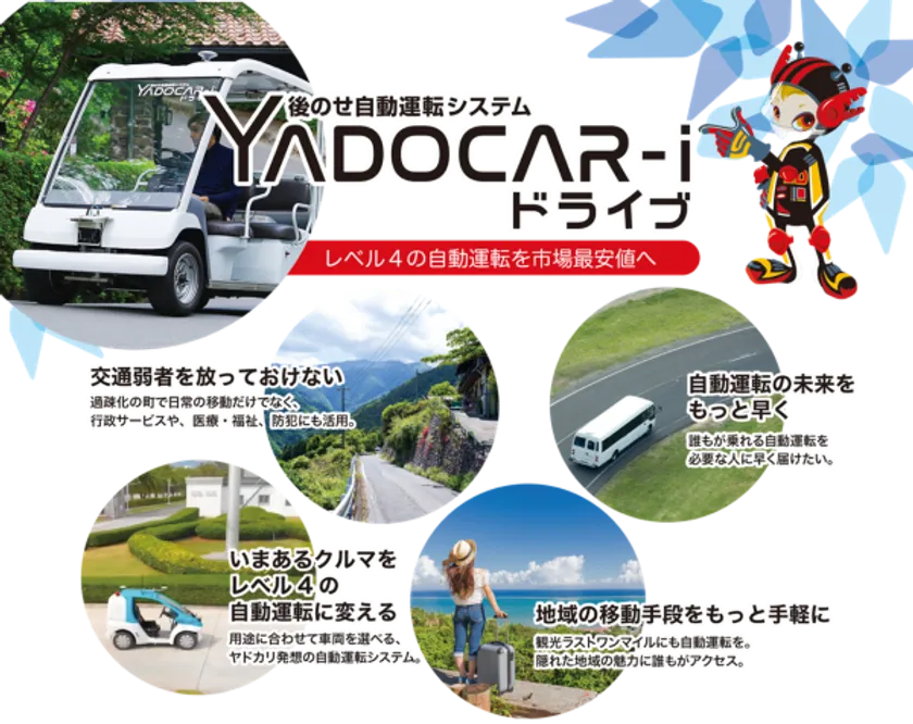 2人乗りのマイクロEVから8人乗りのマイクロバスなど既存車へ手軽にレベル4の自動運転へと変えられる後のせ式の自動運転システムです。準天頂衛星みちびきを主軸にしたGPSの位置情報を使った走行ルートは、誤差15cmのサブセンチ級測位のため、狭い道でも走行します。「交通手段がなくて行けない」「免許返納で運転できないから不便」「人手が足りていない」という課題解決のため、YADOCAR-iドライブが生まれました。地域の方々と一緒に考えていける自動運転を目指しています。( https://www.tokai-clarion.co.jp/yadocar-i/ )