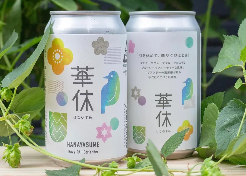 『華休 -はなやすめ-』は、籠屋ブルワリーの地元・狛江地域の人たちと一から開発したクラフトビールです。試飲会を重ねながら味の方向性や商品名を話し合い、コンセプトに合うものを選んでいきました。缶のデザインも狛江在住のデザイナーへ依頼。「華休」という商品名から、羽を休める鳥と花のデザイン、そして「Japanese Craft Beer」を掲げる籠屋ブルワリーの「和」テイストも感じられるデザインとなっています。地元に愛されるお店であることを念頭に今日まで来た、籠屋ならではの商品です。