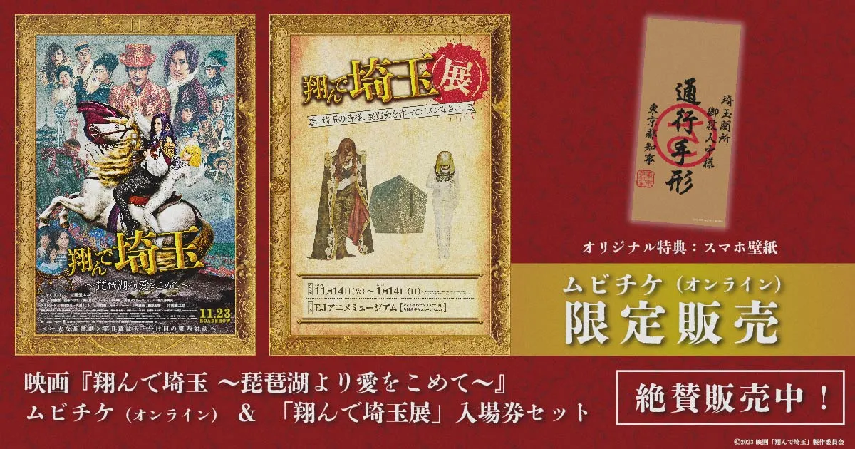 『翔んで埼玉~琵琶湖より愛を込めて~』(11月23日(金)公開)のムビチケ前売券(オンライン)と、『翔んで埼玉展 -埼玉の皆様、展覧会を作ってゴメンなさい。-』(11月14日(火)開幕)の入場券がセットになった、ムビチケバンドルチケットの販売が決定!