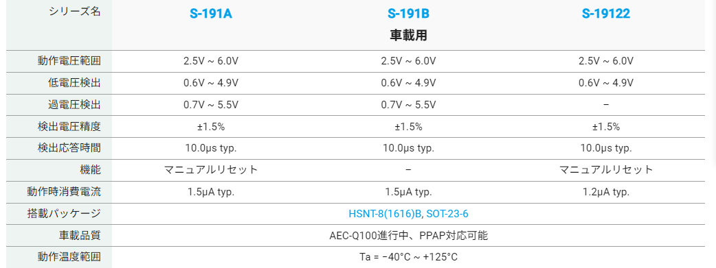 なお、「S-191Aシリーズ」はPPAP(Production Part Approval Process: 生産部品承認プロセス)に対応しており、車載ICの品質規格AEC(*)-Q100 Grade1(*Automotive Electronics Council: 車載電子部品評議会)にも対応予定です。